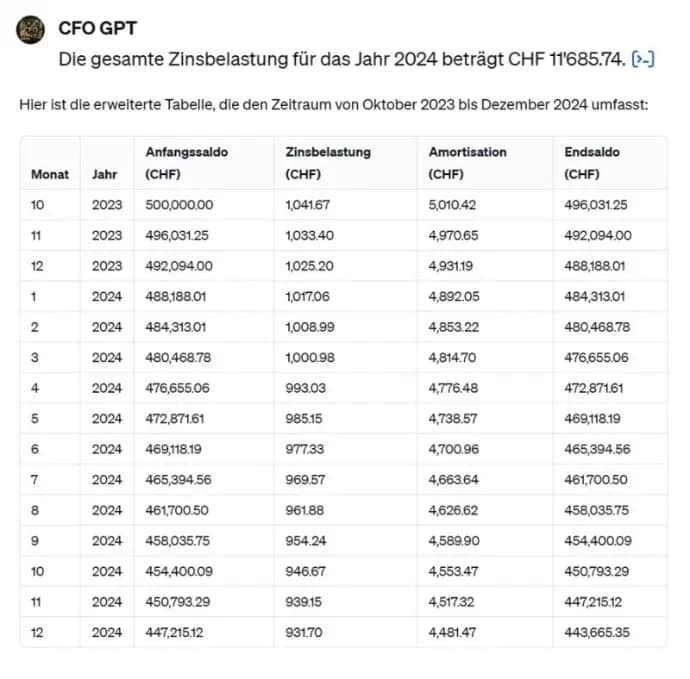 🔍 Die Aufgabe ist nicht ganz trivial. CFO GPT musste erkennen, dass die Amortisation des Darlehens bereits im Oktober 2023 beginnt, die Zinsberechnung sich jedoch ausschließlich auf das Jahr 2024 bezieht. Zudem musste die Berechnung der 1%igen Amortisation nach der Zinsbelastung erfolgen – ein Detail, das leicht übersehen werden könnte.