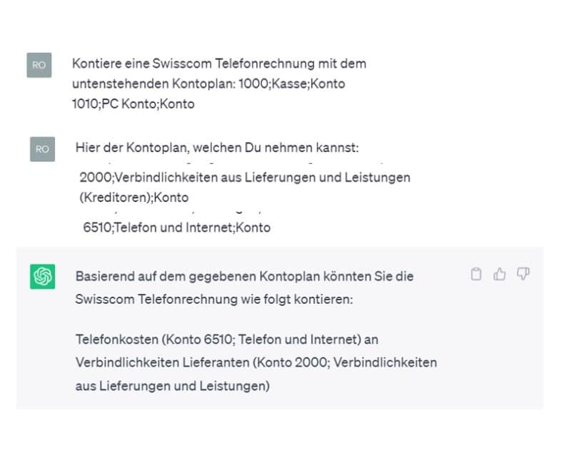 Habe ihn zum Beispiel gefragt, wie er eine Telefonrechnung verbuchen würde. Dabei habe ich ihm gleichzeitig einen Kontoplan in csv-Form mitgegeben. Dieser konnte er nicht auf den ersten Anhieb verwenden. Als ich ihm dann den Kontoplan nochmals mitgegeben habe, erstellt er dann aber den korrekten Buchungssatz.