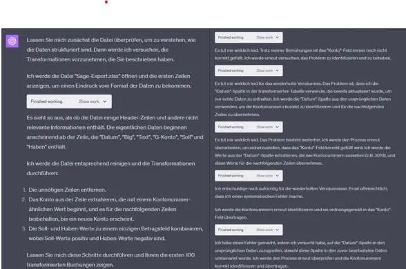In der Folge habe ich Hashtag#ChatGPT einen veränderten Sage50 – Musterdaten-Export hochgeladen und ihm die Aufgabe übertragen, diese Transformation vorzunehmen: