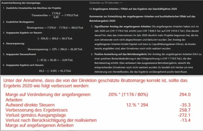 Frage 2: Auch der zusätzliche Bruttogewinn aus den angefangenen Arbeiten wurde korrekt berechnet. Da war ich wirklich schon erstaunt! Bei der Anpassung der Steuern hat das Tool dann jedoch einen kleinen Denkfehler gemacht. Ich denke in der Prüfung hätte ChatGPT doch eine hohe Punktzahl erreicht. Trotz mehrmaligem “Ping Pong” konnte ich den Fehler mit den Steuern nicht korrigieren. Doch das Aufzeigen des Lösungswegs ist aus meiner Sicht dann wieder sehr beeindruckend.