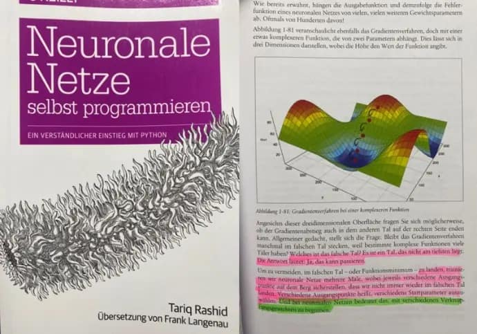 Das Buch war herausfordernd, aber unglaublich aufschlussreich, vor allem die unten kopierte Seite mit dem Gradienten-Verfahren(!) hat mir sehr geholfen. Wie findet das neuronale Netz den optimalen Punkt. Das Bild mit der Aussage konnte ich mir gut merken, beim Rest rund herum (Mathematik, Statistik und Geometrie) verstehe ich immer noch schnell nur Bahnhof!