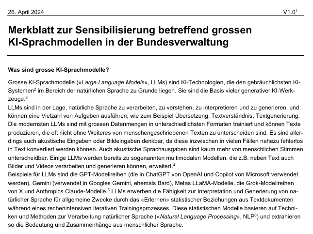 Das Merkblatt der Bundesverwaltung finden Sie: https://cnai.swiss/dienstleistungen-weitere-dienstleistungen-merkblaetter-zu-ki/