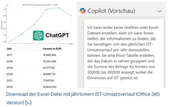 Im Gegensatz dazu musste ich die Rohdaten bei Microsoft Copilot in eine formale “Tabelle” umwandeln, um die Analyse überhaupt zu starten. Und als ich nach einer Darstellung des jährlichen IST-Umsatzverlaufs fragte, erhielt ich die ernüchternde Antwort, dass keine Grafiken oder Excel-Dateien erstellt werden können. Stattdessen wurde mir vorgeschlagen, eine Pivot-Tabelle zu erstellen.