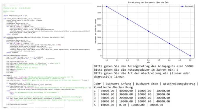 Vor Kurzem habe ich mithilfe von ChatGPT z.B. einen Abschreibungsrechner für lineare und degressive Abschreibung programmiert.