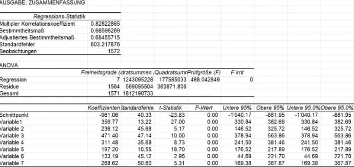 Sobald Excel die Datenanalyse abgeschlossen hat, kann es herausfordernd sein, die Ergebnisse zu deuten (siehe Bild). Das ist der Punkt, an dem ChatGPT erneut ins Spiel kommt. Die Variabeln der Ergebnisse in Excel einfach wegen der Vertraulichkeit umbenennen und die Ergebnisse von Excel bei ChatGPT hochladen.