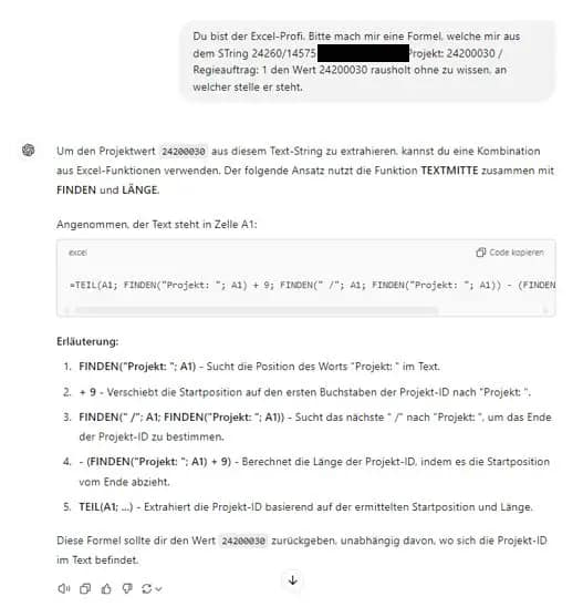Im Buchhaltungs-Export aus unserem ERP stand irgendwo im Text-String die Projekt-Nummer, aber deren Position war immer an einem anderen Ort – die Nummer des Projekts stand mal vorne, mal mittendrin. Das Einzige, was immer identisch war, dass die Projekt-Nummer nach dem Wort „Projekt:“ kam. Ich fragte ChatGPT, ob es mir eine Formel erstellen könnte, um die Nummer ohne festen Startpunkt zuverlässig herauszufiltern und gab ihm nur EINEN Beispiel-String. Er konnte den generischen Aufbau des Textfeldes über mehrere Transaktionen also nicht wirklich kennen.