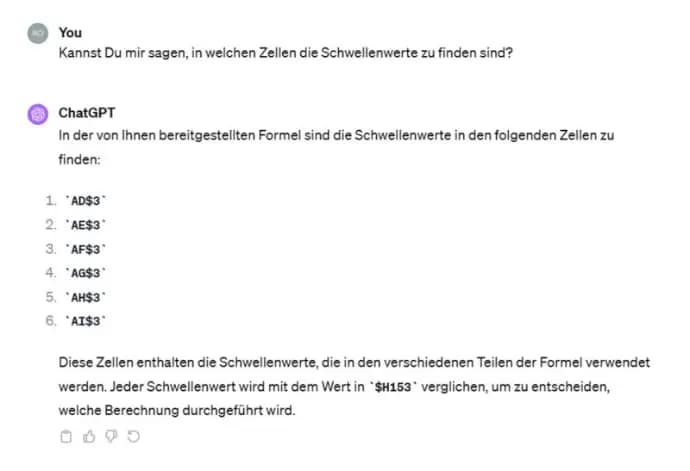 👆 In der Folge wollte ich aber wissen, in welchen Zellen denn die veränderbaren Schwellenwerte im Excel-Tabellenblatt konkret zu finden sind. Anstatt mich selber durch die mühsame Aufgabe zu kämpfen, diese Felder aus der Formel herauszufischen, entschied ich mich, ChatGPT um Hilfe zu bitten.