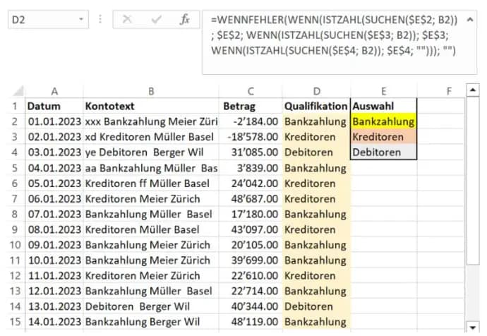 In Spalte B stehen die Buchungs-Texte der downgeloadeten Transaktionen vom Kontoauszug. Wenn ein Textbaustein aus einer fixen Liste (E2-E4) in einem dieser Texte gefunden wird, egal an welcher Stelle, sollte er in Spalte D geschrieben werden. Zum Beispiel, wenn “Bankzahlung”, “Kreditoren” oder “Debitoren” irgendwo in B2 auftauchen, sollte es in D2 stehen. So kann die gewünschte Qualifikation designt werden.